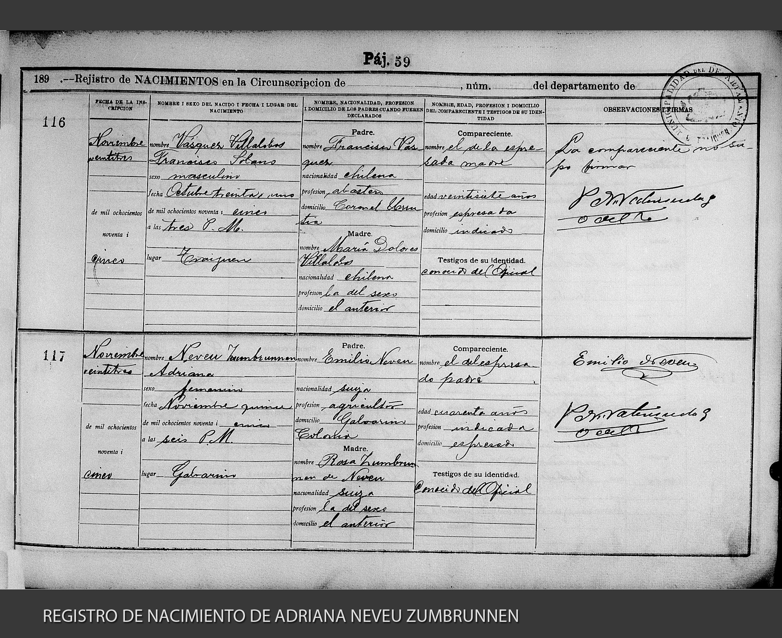 Adriana nace el 15 de Noviembre de 1895 a las 6 pm. en Galvarino, Chile.