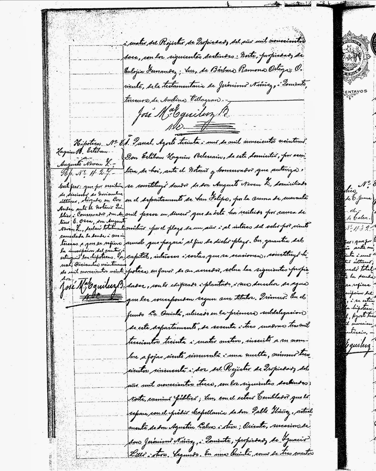 Hipoteca N° 81 Parral, Agosto treinta i uno de mil novecientos veitiuno. Don Esteban Haguin ------, de este domicilio, por escritura de hoi, ante el Notario y Conservador que autoriza se constituyó deudor de don Augusto Neveu Z. domiciliado en el departamento de San Felipe, por la suma de cuarenta mil pesos en dinero que de éste a recibido por causa de mutuo por el plazo de un año i al interés del ocho porciento anual que pagará al fin del dicho plazo. En garantía del capital, intereses i costas que se ocasionen, constituyendo hipoteca en favor de su acreedor, sobre las siguientes propiedades, con lo edificado y plantado, i sus derechos de agua que les correspondan según sus títulos. Primero. En el fundo La Quinta, ubicado en la primera subdelegación de este departamento, de sesenta i tres cuadras tres mil trecientos treinta i cuatro metros inscritos a su nombre a fojas ciento cincuenta i una --------, numero trecientos cincuenta i dos del Registro de Propiedad del año mil novecientos trece, con los siguientes deslindes, Norte, camino público, Sur, con el estero -------- que lo separa con el predio Capellanía de Don Pablo Ibáñez, actualmente de don Agustín Labra i otros; Oriente, sucesión de Don Jerónimo Núñez, i Poniente, propiedad de Ignacio Lillo i otros. Segundo, En una quinta, como de tres cuartos. NOTA: los puntos corresponden a un texto ilegible que no pude descifrar, y lo otro, es que claramente este archivo está incompleto, es el único texto que se pudo conseguir.
