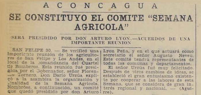 ACONCAGUASE CONSTITUYÓ EL COMITÉ "SEMANA AGRÍCOLA"SERA PRESIDIDO POR DON ARTURO LYON.- ACUERDOS DE UNA IMPORTANTE REUNION. SAN FELIPE 30.- Se verificó una importante reunión de los agricultores de San Felipe y Los Andes, en el local de la comamndancia del Cuartel de Bomberos. Esta reunión fué presidida por el Gobernador, señor Florencio torener. don Darío Urzúa explicó a la asamblea la organización y finalidad de la Semana Agrícola. Nombróse, a continuación, un comité que quedó presidido por don Arturo Lyon Peña, y en el que actuará como secretario el señor Augusto Neveu. Este comité tendrá representantes de todas las comunas y departamentos. El señor Urzúa fué muy felicitado. Después de otros cambios de ideas, se estableció el gran entusiasmo existente por cooperar a las labores de estas Semana, que se considera de gran interés regional y nacional.- (Aguirre). Si eres descendiente directo de Emile Auguste, y tienes más información de él, haz un esfuerzo y compártela.
