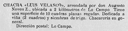 Chacra Luis Velazco: Arrendada por Don Augusto Neveu Z., ubicada a 2 k. de Lo Campo, tiene una superficie de 10 cuadras planas regadas. Dedicada a Viña (2 cuadras) y siembras de trigo. Chacarería en general.Dirección Postal: Lo Campo.