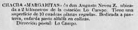Chacra Margaritas: de Don Augusto Neveu Z., ubicada a 2 k. de la Estación Lo Campo, tiene una superficie de 10 cuadras planas regadas. Dedicada a pasteria, enfarda pasto alfalfa en colizas.Dirección Postal: Lo Campo.