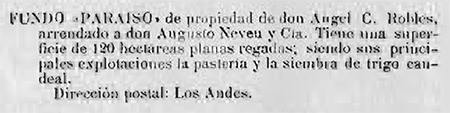 Fundo Paraíso: de propiedad de Don Ángel C. Robles, arrendado a Don Augusto Neveu y Cía., tiene una superficie de 120 hectáreas planas regadas, siendo sus principales explotaciones la pasteria y la siembra de trigo candeal.Dirección Postal: Los Andes. Hay también otra información que corresponde al año 1921, suscrito en Parral y que se refiere a una hipoteca en favor de Emile Auguste
