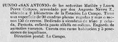 Fundo San Antonio: De las señoritas Matilde y Laura Pérez Cotapos, arrendado por don Augusto Neveu Z., ubicada a 2 k. de la Estación lo Campo. Tiene una superficie de 90 cuadras planas regadas y más o menos 150 de cerros. Dedicado a siembra de trigo y cebada. Pastería, enfarda pasto alfalfa en colizas. Engorda de animales vacunos. Cuenta con casas habitación y 5 posesiones de inquilinos.Dirección Postal: Lo Campo.