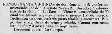 Fundo Santa Virginia: de Don Romualdo Silva Cortez, arrendado por don Augusto Neveu Z., ubicado a 1 k. de la estación Lo Campo. Tiene una superficie de 30 cuadras planas regadas y más o menos 100 de cerros. Dedicado a pasteria, enfarda pasto alfalfa, chacarería. Engordas y siembras de trigos y cebadas. Cuenta con casas habitación y 3 posesiones de inquilinos.Dirección Postal: Lo Campo.