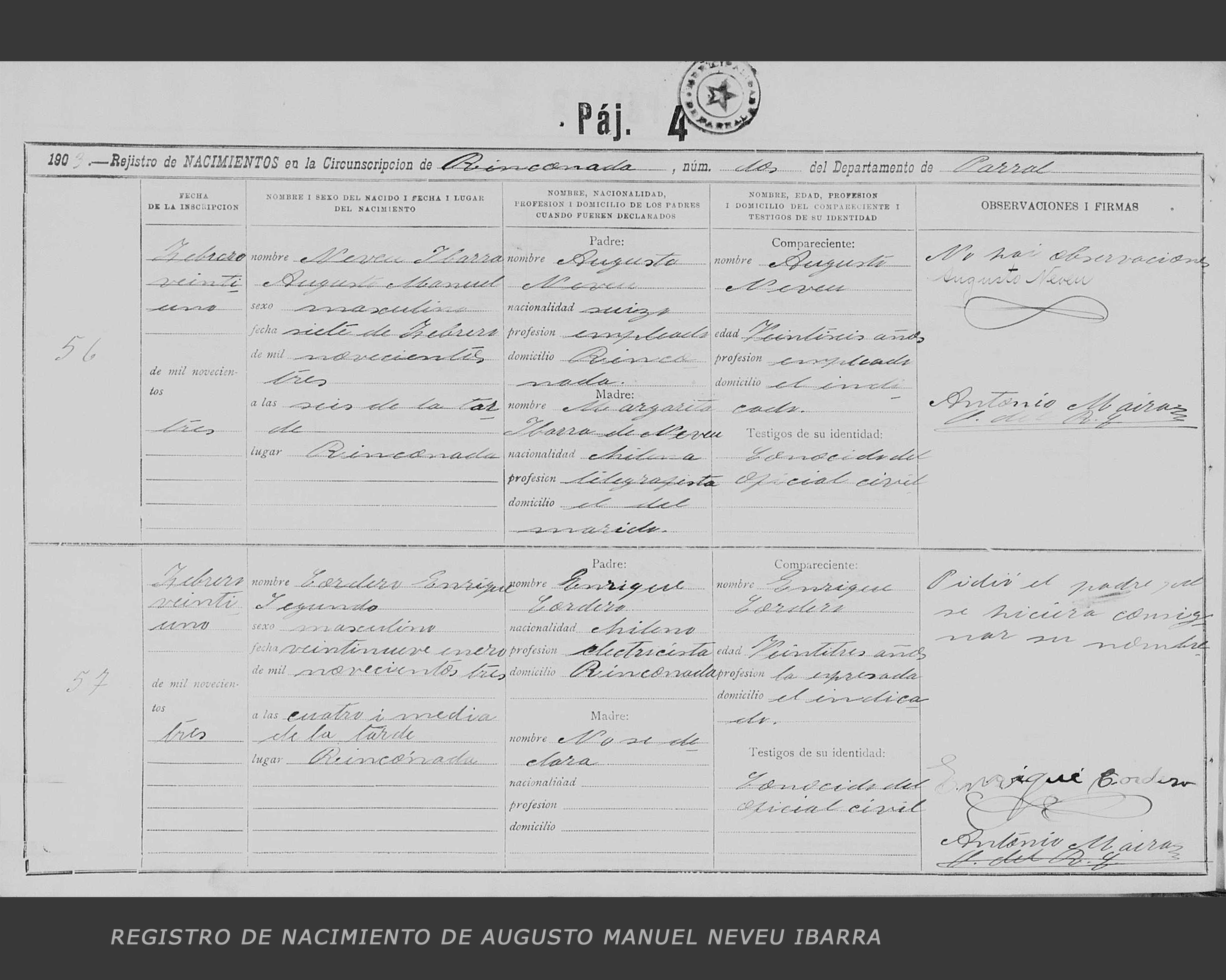 en Rinconada de los Andes, Quinta Región, Chile.Acta de nacimiento de Emile Acta de Nacimiento de Emile Auguste HIJOS:1. Augusto Manuel Neveu Ibarra 2. Alberto Neveu Ibarra3. Margarita Neveu Ibarra