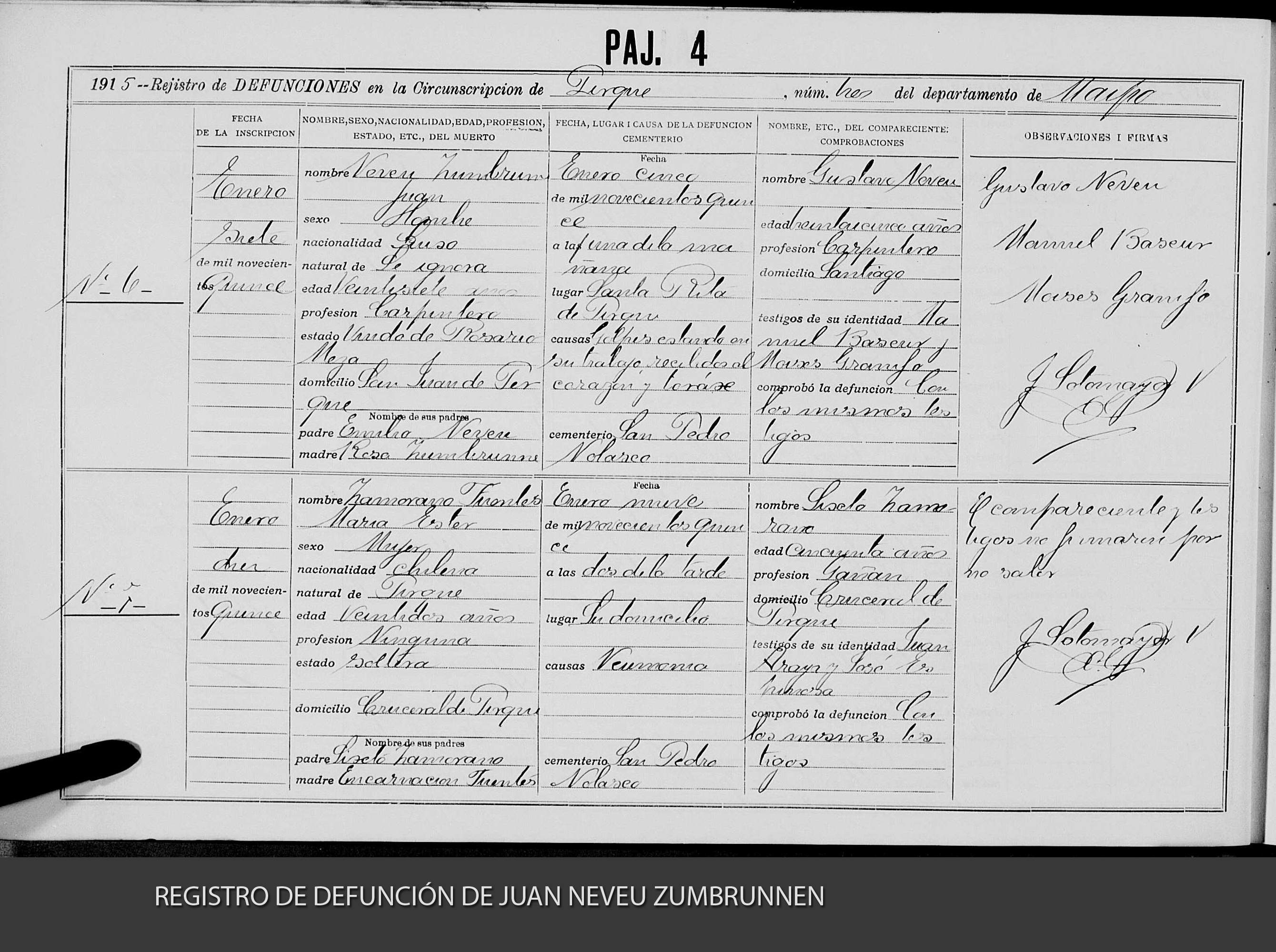 Juan Neveu, nace aproximado el año 1888, se casa con doña Rosario Meza.Juan fallece a la edad de 27 años, el 05 de Enero de 1915 a las 01 am. Causa de muerte: golpes recibidos en corazón y tórax, estando en su trabajo. Registro de defunción de Juan Neveu.
