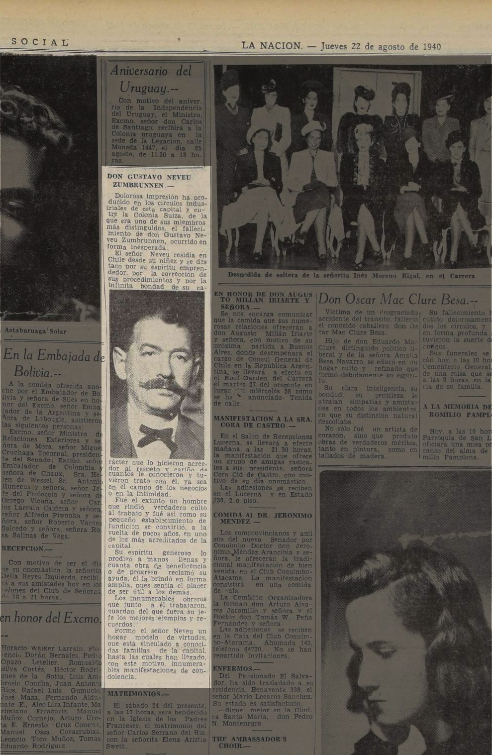 TRANSCRIPCIÓN DE NOTA DE DIARIO LA NACIÓN - JUEVES 22 DE AGOSTO DE 1940DON GUSTAVO NEVEU ZUMBRUNNEN Dolorosa impresión ha producido en los círculos industriales de esta capital y entre la colonia Suiza, de la que era uno de sus miembros mas distinguidos, el fallecimiento de don Gustavo Neveu Zumbrunnen, ocurrido en forma inesperada.El señor Neveu residía en Chile desde su niñez y se destacó por su espíritu emprendedor, por la co