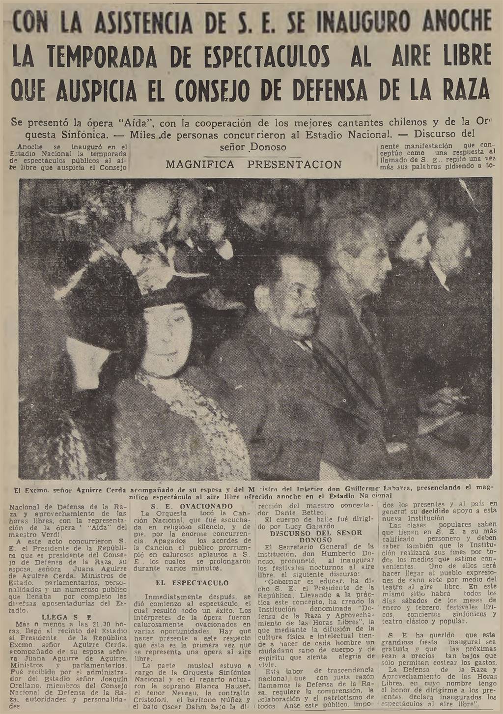 Se presentó la ópera “Aída’’, con la cooperación de los mejores cantantes chilenos y de la Orquesta Sinfónica. — Miles.de personas concurrieron al Estadio Nacional. — Discurso del Señor Donoso.