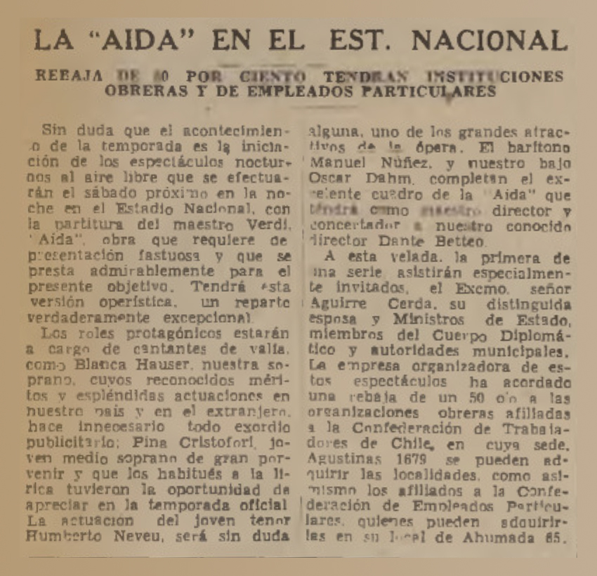 Sin duda que el acontecimiento de la temporada es la iniciación de los espectáculos nocturnos al aire libre que se efectuarán el sábado próximo en la noche en el Estacio Nacional, con la partitura del maestro Verdi, "Aida", obra que requiere de presentación fastuosa y que se presta admirablemente para el presente objetivo.